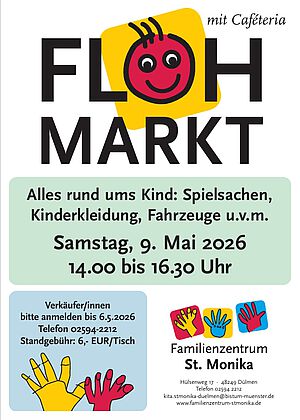 Interessierte Verkäufer können sich bis zum 06. Mai2026 verbindlich im Familienzentrum St. Monika, Hülsenweg 17, 48249 Dülmen, tel.: 02594-2212 anmelden.